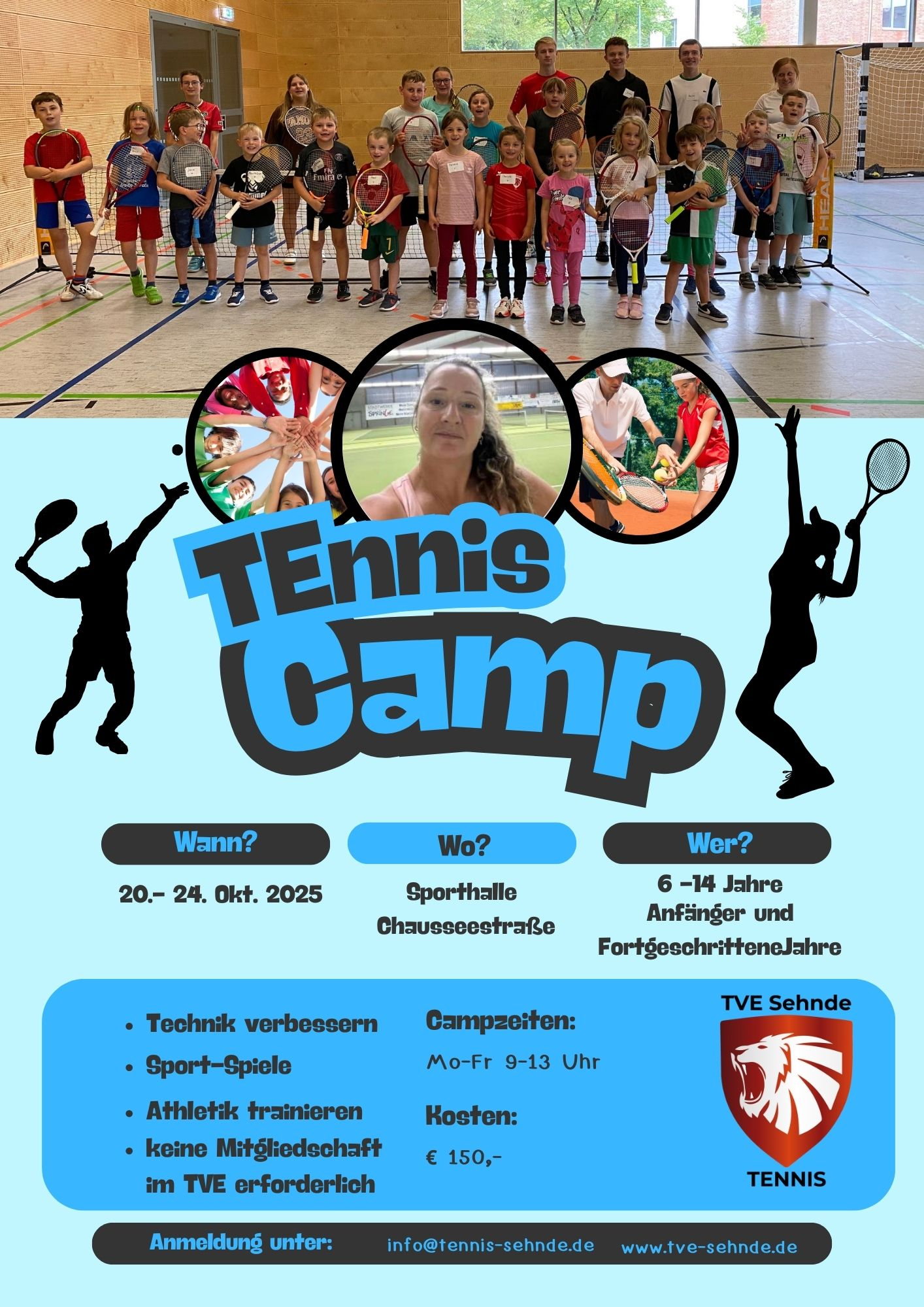 Der TVE Sehnde lädt Kinder und Jugendliche im Alter von 6 bis 14 Jahren in den Herbstferien zum Tenniscamp ein. Von Montag, 20. Oktober, bis Freitag, 24. Oktober 2025, wird in der Sporthalle an der Chausseestraße täglich von 9 bis 13 Uhr trainiert. Teilnehmen können Anfänger ebenso wie Fortgeschrittene, eine Vereinsmitgliedschaft ist nicht erforderlich.
