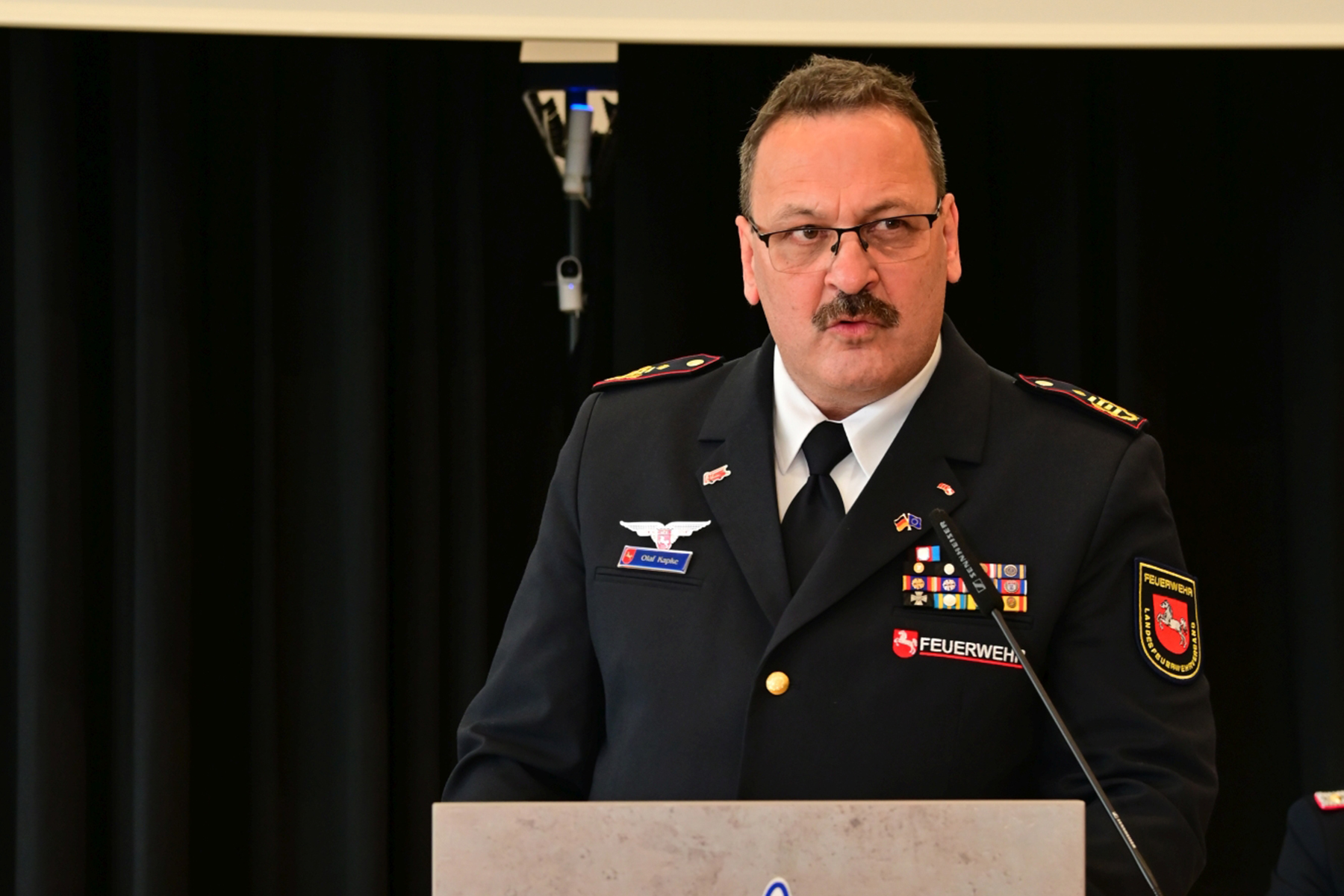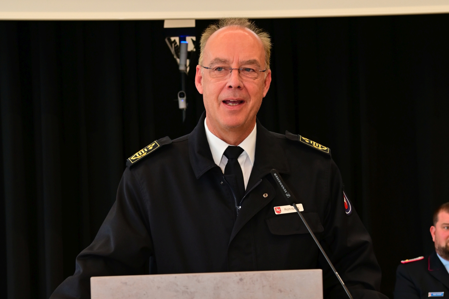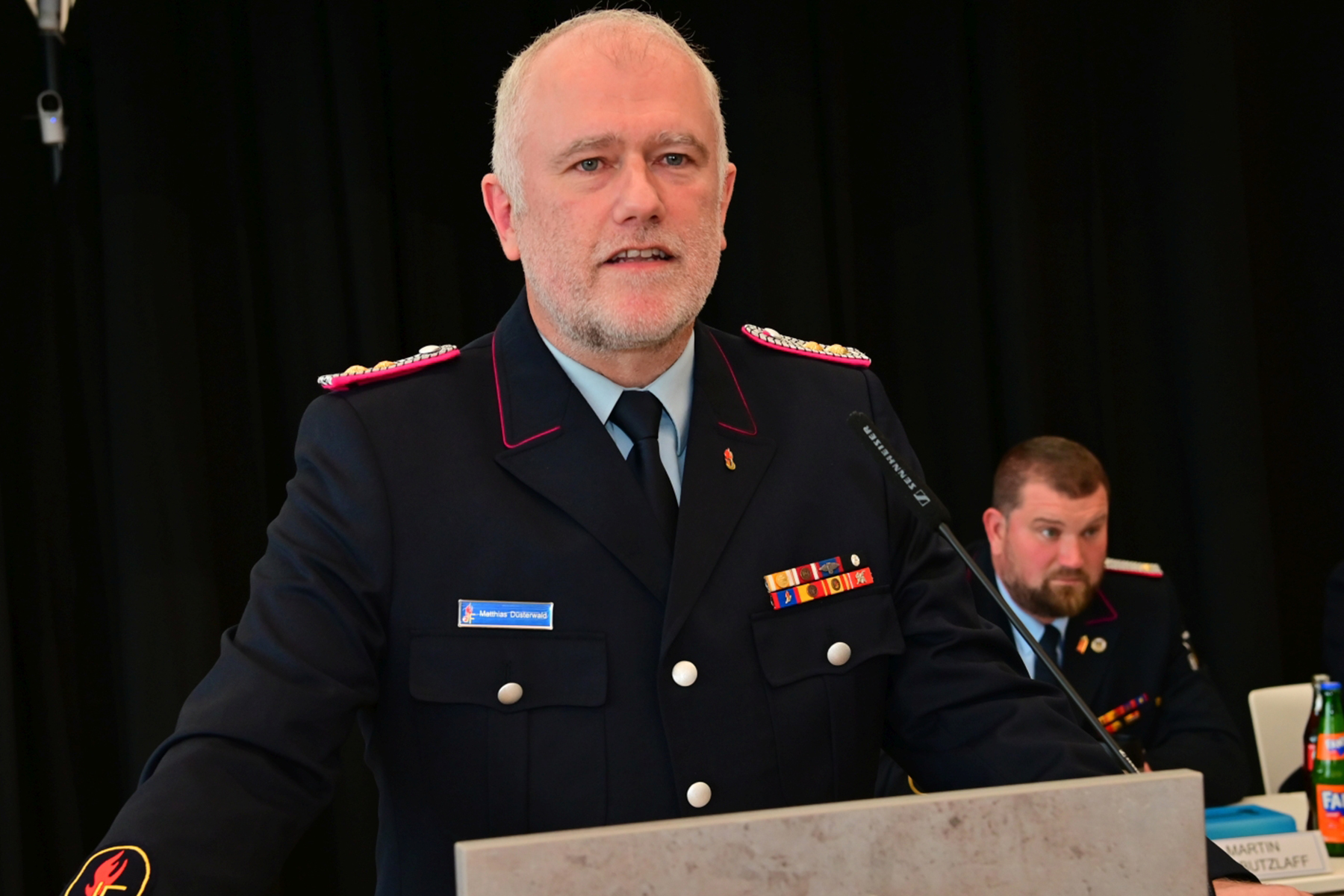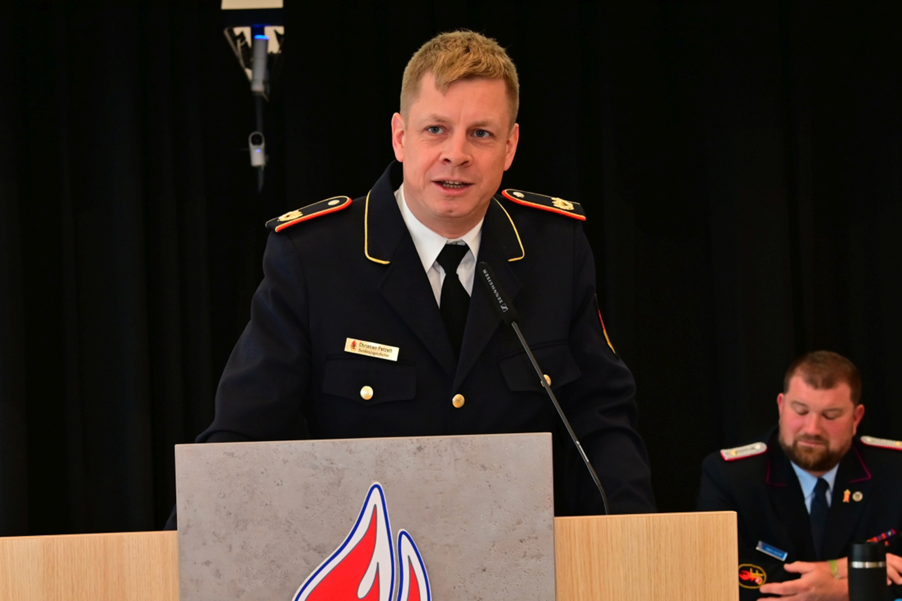 Auf die Begrüßung der Landes-Jugendsprecher folgte Landes- Kinder- und Jugendfeuerwehrwart (LKJFW) Matthias Düsterwald, der sich seinerseits ebenso begeistert über einen vollen Saal zeigte. Zudem begrüßte Düsterwald eine Vielzahl an Gästen aus Politik, Feuerwehrkreisen und ehemaligen Funktionsträgern der NKJF. Darunter unter anderem Bundesjugendleiter Christian Patzelt, Landesbranddirektor Dieter Rohrberg und Marita Wilmes von der Bingo-Umweltstiftung.