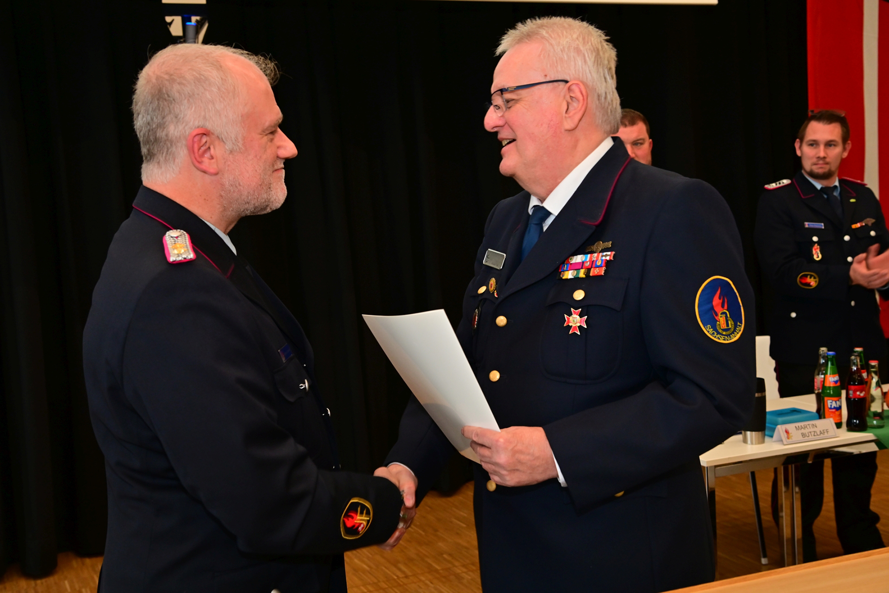 Eine Überraschung gab es beim Grußwort von Thomas Voß, dem Landes-Jugendfeuerwehrwart aus Sachsen-Anhalt. Dieser hatte mehr als nur ein paar warme Worte für die Versammlung dabei. Voß zeichnete seinen Niedersächsischen Kameraden Matthias Düsterwald, unter großem Beifall der Versammlung, mit der Ehrennadel der Jugendfeuerwehr Sachsen-Anhalt aus. Voß und Düsterwald arbeiten seit 10 Jahren auf Bundesebene und darüber hinaus zusammen. „Im Bereich Bildungsarbeit durfte ich, und damit auch die Jugendfeuerwehr Sachsen-Anhalt, sehr viel von Matthias lernen“, erklärte Voß bei der Verleihung.
