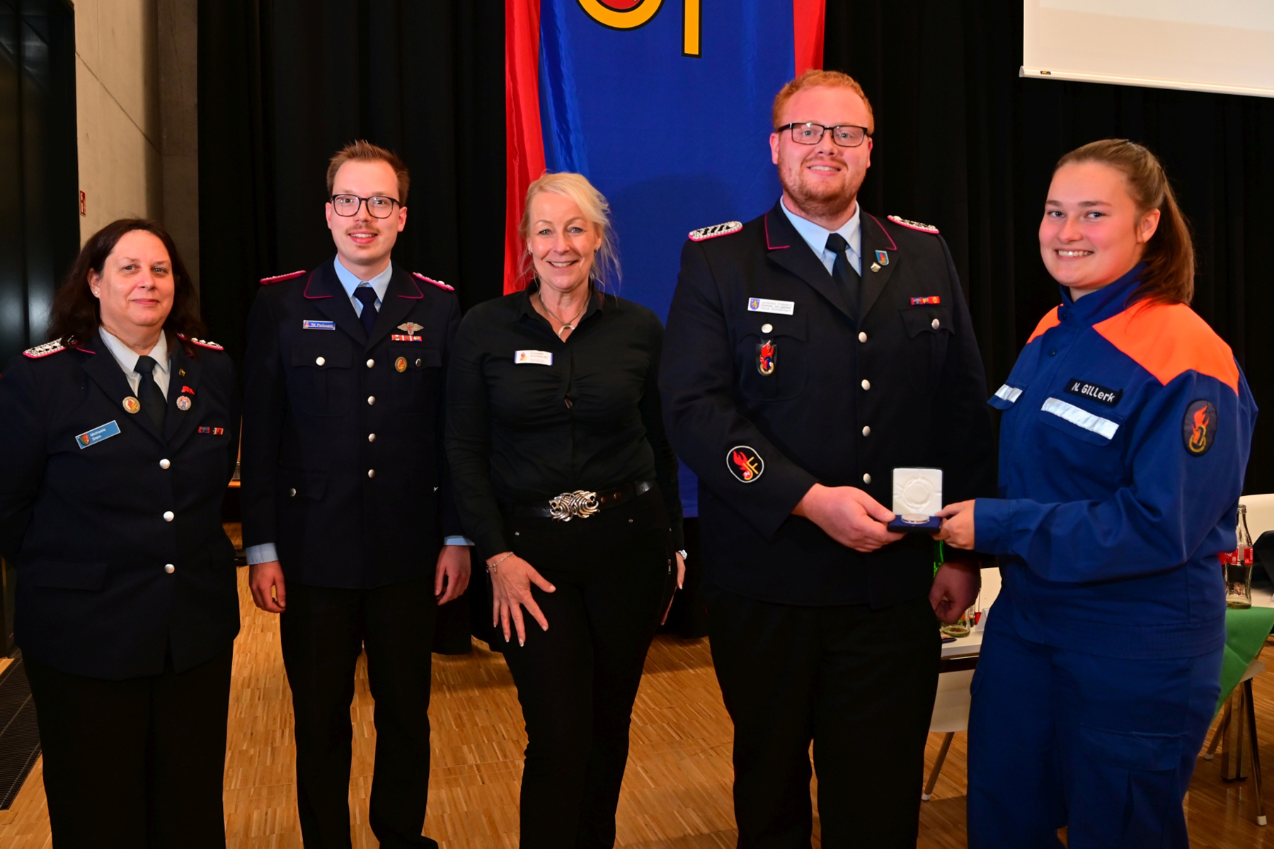 Nach langjährigem Engagement wurden die folgenden Personen verabschiedet und erhielten als Dankeschön eine Auszeichnung: Die Bronze-Medaille erhielten Pascal Bründermann, stellvertretender Bezirks- Kinder- und Jugendfeuerwehrwart Weser-Ems, sowie Landes-Jugendsprecherin Neele Gillerke.
