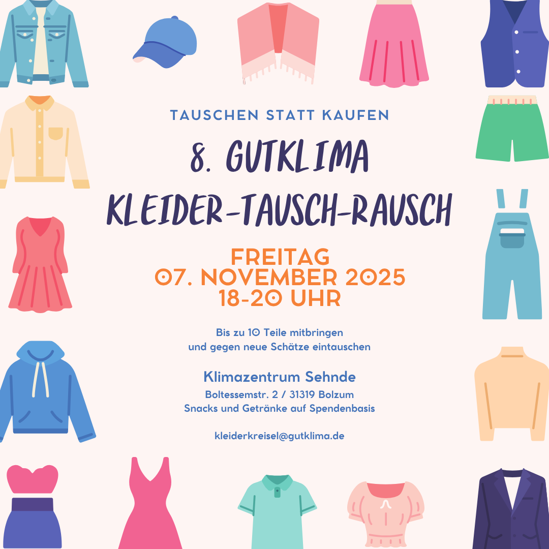 Schon zum achten Mal lädt der Dorfverein „Gutes Klima im Dorf“ am kommenden Freitag, 7. November 2025, zum beliebten Kleider-Tausch-Rausch ins Klimazentrum Sehnde, Boltessemstraße 2 in Bolzum ein. Unter dem Motto „Tauschen statt Kaufen“ dreht sich von 18 bis 20 Uhr alles darum, Mode nachhaltig zu denken – und gemeinsam Spaß dabei zu haben.