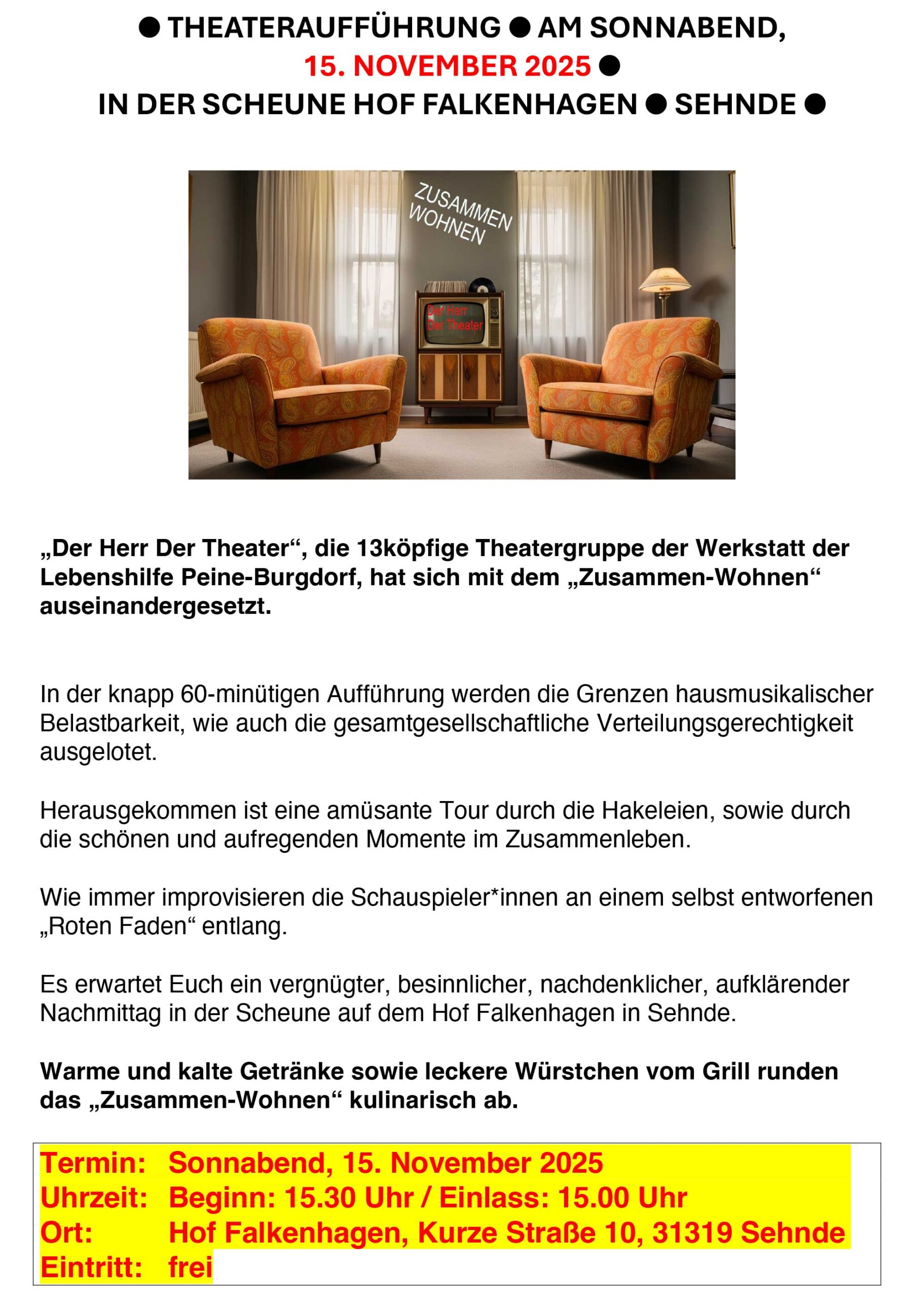 Am Sonnabend, 15. November 2025, um 15.30 Uhr lädt die Theatergruppe der Werkstatt der Lebenshilfe Peine-Burgdorf zu einer besonderen Aufführung in die Scheune auf dem Hof Falkenhagen, Kurze Straße 10 in Sehnde, ein. Unter dem Titel „Zusammen wohnen“ präsentiert die 13-köpfige Gruppe „Der Herr der Theater“ ein selbst entwickeltes Stück rund um die Herausforderungen, aber auch die schönen Seiten des Zusammenlebens.