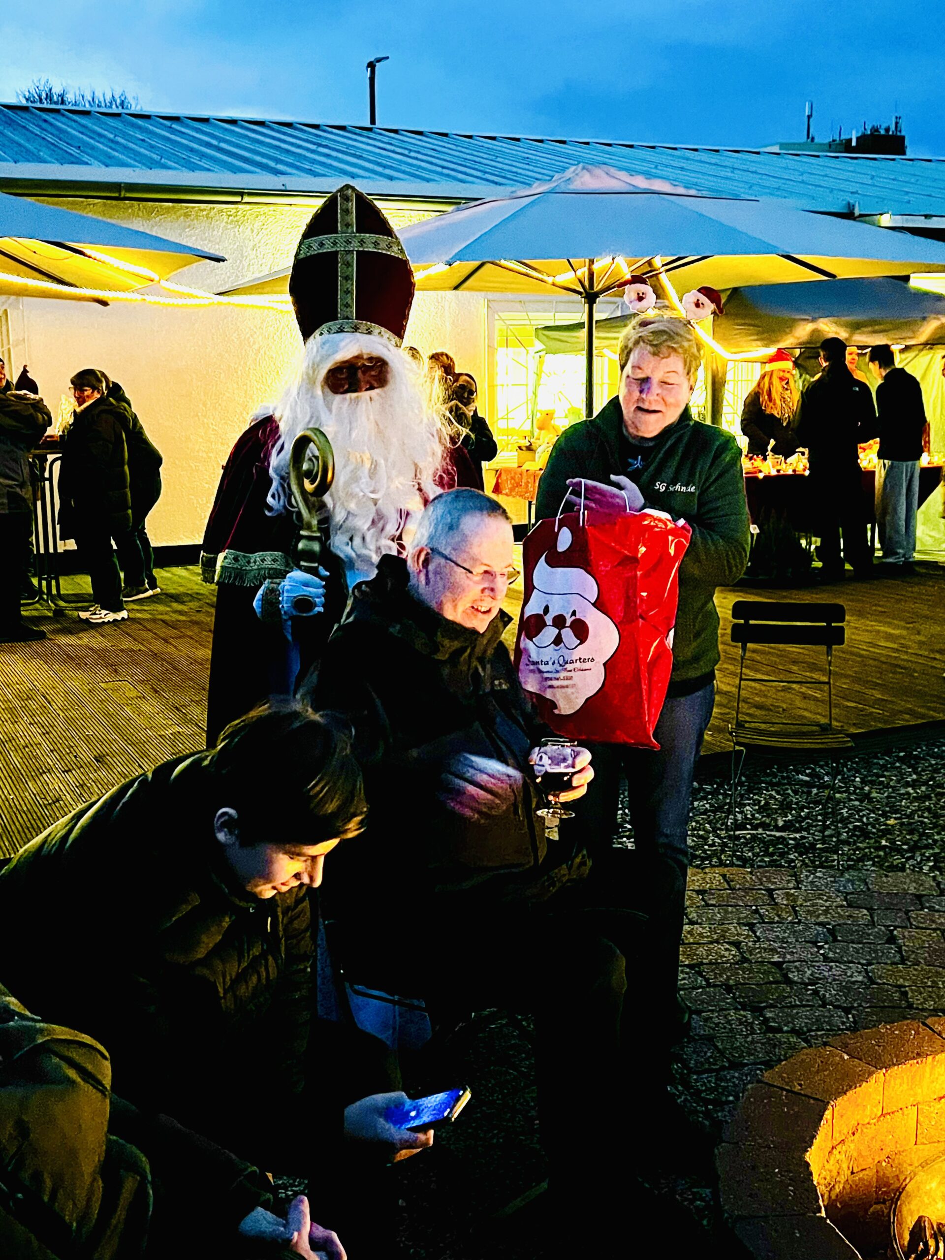 Im Zentrum des Budenrunds sorgte eine große Feuerschale für besondere Atmosphäre. Dort konnten Kinder und Erwachsene Stockbrot rösten und die vorweihnachtliche Stimmung im Freien genießen. Ein weiterer Höhepunkt war der Besuch des Weihnachtsmannes. Er nahm sich Zeit für die Kinder, hörte Gedichte an und verteilte Süßigkeiten. Der Adventsmarkt bot damit einen stimmungsvollen Rahmen zum Ausklang des Jubiläumsjahres am Schützenhaus.