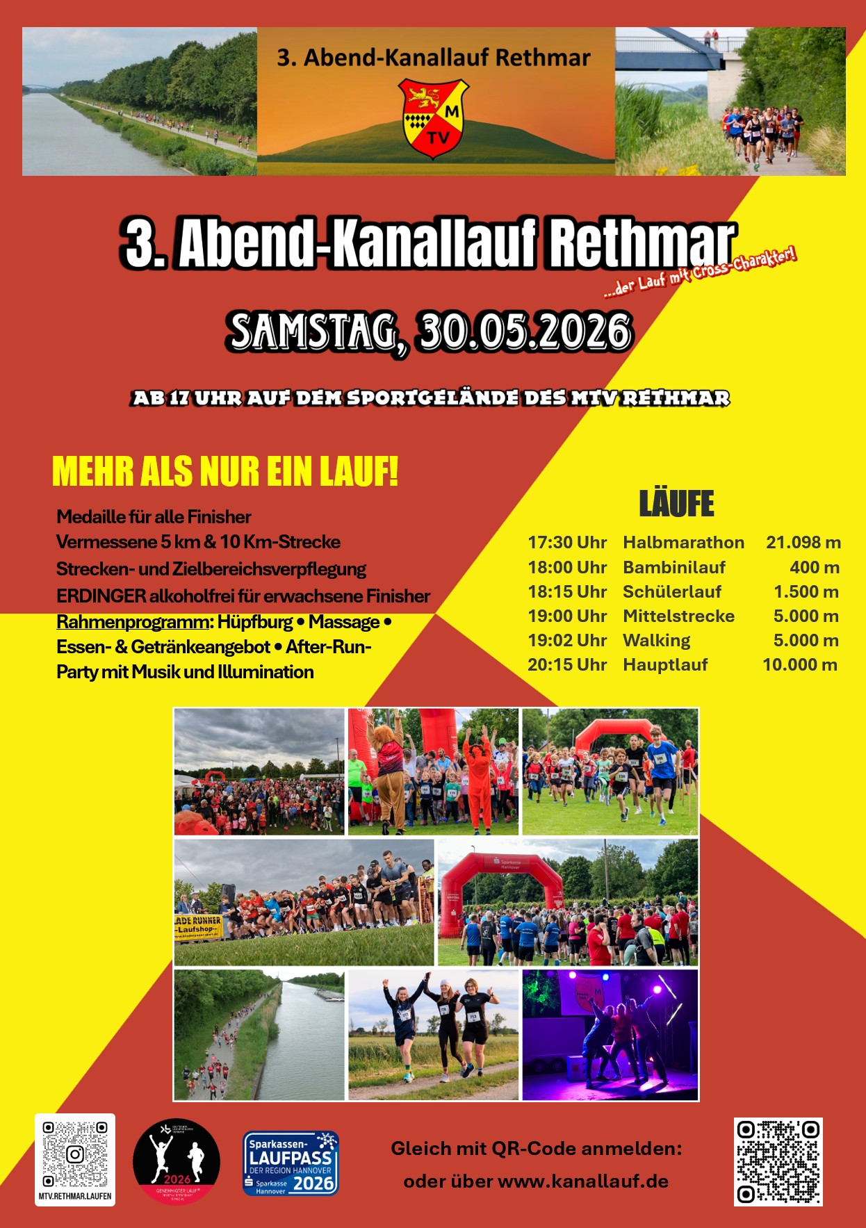 Meldeschluss für personalisierte Startnummern ist Mittwoch, 20. Mai 2026. Danach ist die Online-Anmeldung nach Angaben der Ausrichter bis zum Veranstaltungstag möglich. Informationen sind über www.kanallauf.de abrufbar, die Anmeldung läuft über https://my.raceresult.com/373954/. Aktuelles zur Veranstaltung veröffentlicht die Laufsparte zudem bei Instagram unter www.instagram.com/mtv.rethmar.laufen.