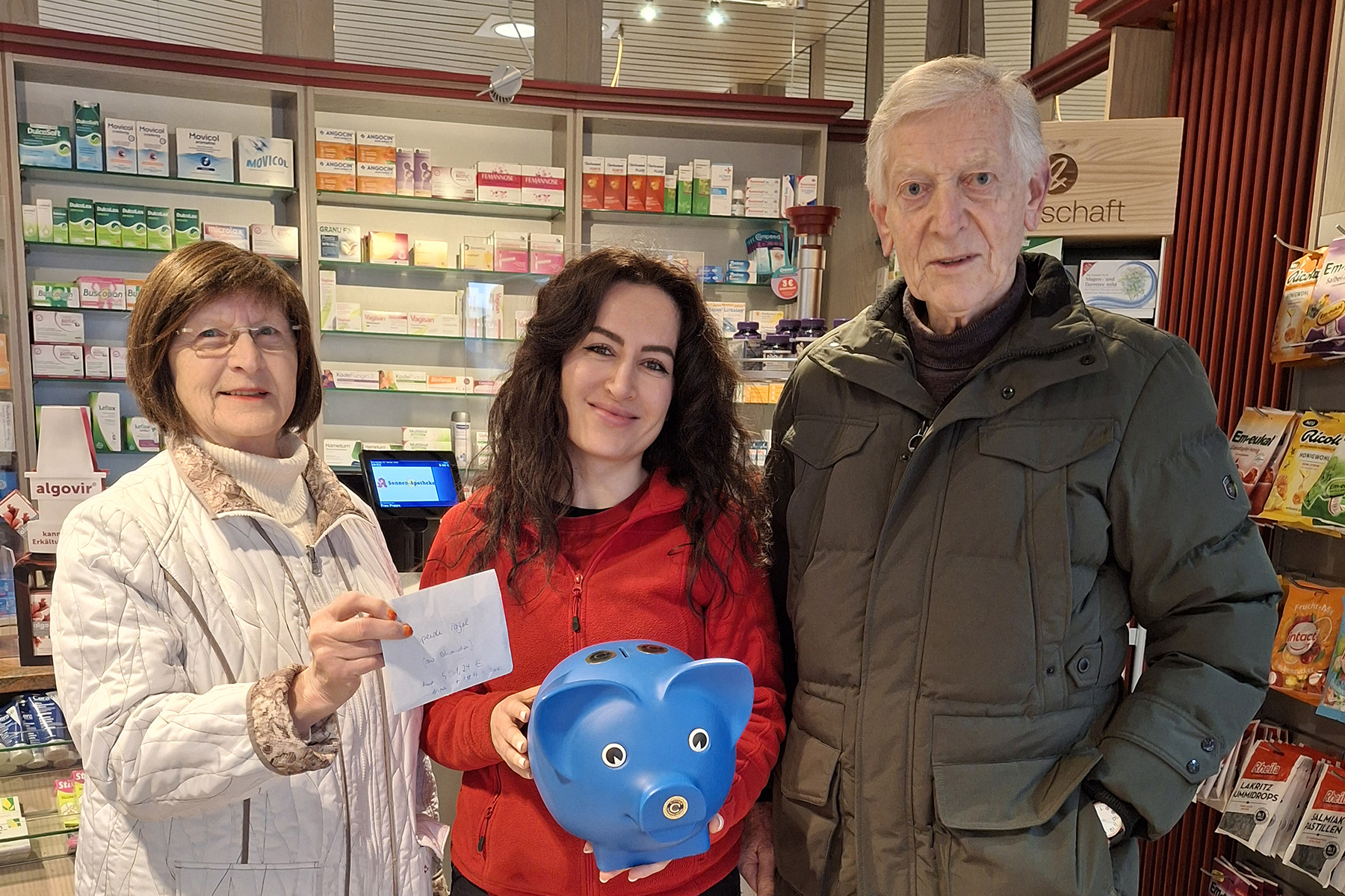 Team und Leitung der Tafel Sehnde freuen sich über die anhaltende Unterstützung für die Tafel Sehnde. Aktuell hat im Dezember 2025 die Inhaberin der Sonnen-Apotheke Sehnde, Berivan Baran Demir, ihre Kunden um Spenden für die Tafel gebeten und dem Tafelleiter Hans-Jürgen Grethe am 14. Januar 2026 eine Spende in Höhe von 700 Euro überreicht. Diese Spende soll für die Osterausgabe der Tafel im April 2026 verwendet werden.