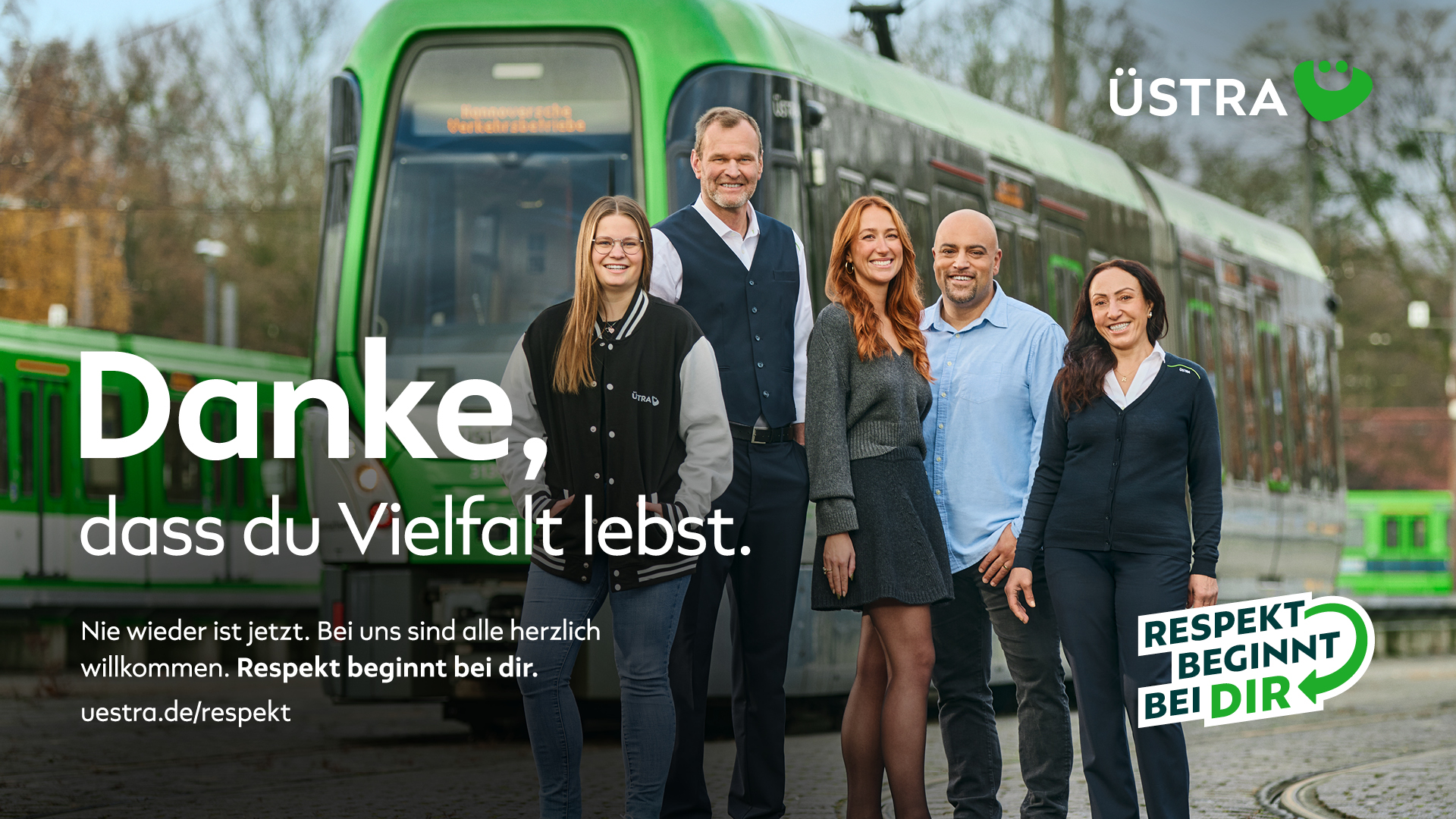 Mit der Kampagne „Respekt beginnt bei dir“ will die ÜSTRA in der Region Hannover für mehr Respekt und Rücksichtnahme im öffentlichen Raum werben. Im Mittelpunkt stehen Alltagssituationen, die für viele Fahrgäste und Beschäftigte prägend sind, etwa laute Telefonate in vollen Bahnen, abfällige Kommentare oder rücksichtsloses Drängeln beim Ein- und Aussteigen. Ziel ist nach Angaben des Unternehmens, Fahrgäste, Mitarbeitende und die Öffentlichkeit für einen respektvollen Umgang zu sensibilisieren und zugleich Haltung zu zeigen. Statt mit erhobenem Zeigefinger zu arbeiten, setzt die ÜSTRA auf positive Botschaften, authentische Motive und Mitarbeitende aus dem Unternehmen.